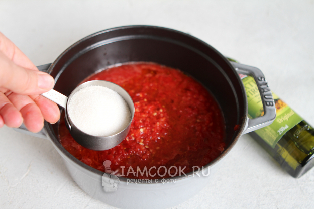 Добавляем оливковое масло и сахар. На 500 г перца я добавила 400 г сахара. Не удивляйтесь такому количеству. Остроту перца в джеме смягчит сладость.