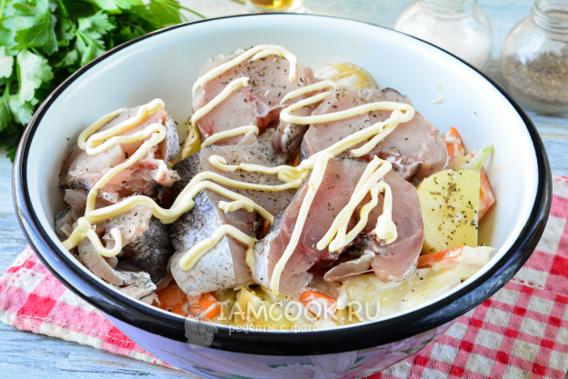 Размороженного минтая почистите, срежьте плавники, удалите внутренности и черную пленку. Рыбу нарежьте средними кусочками. Минтая выложите в миску с овощами, добавьте еще немного специй по вкусу, полейте дополнительно майонезом.