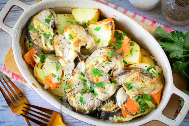 Форму для запекания смажьте растительным маслом, выложите туда весь картофель с овощами и минтаем.