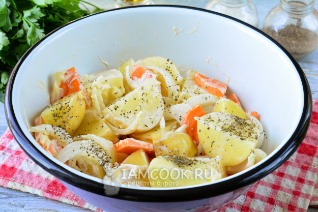 В отдельную миску выложите картофель, лук и морковь, добавьте специи по вкусу, влейте немного майонеза и перемешайте.