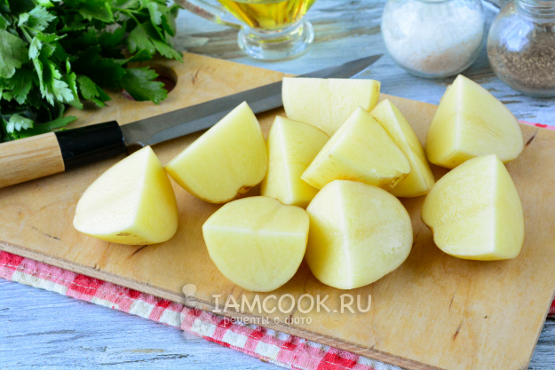 Почистите картофель, сполосните его и нарежьте крупными дольками.