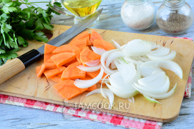 Почистите овощи - лук и морковь. Нарежьте их полукольцами.