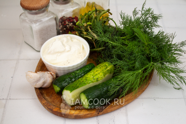 Соберите необходимые продукты для приготовления белого соуса с огурцом к шашлыкам.