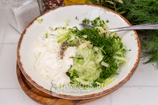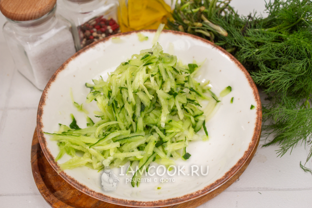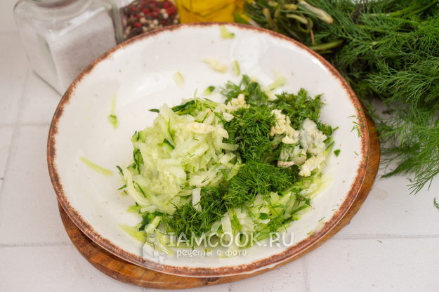 В подходящую посуду сложите отжатый огурец, мелко нарезанный укроп и чеснок, пропущенный через пресс.