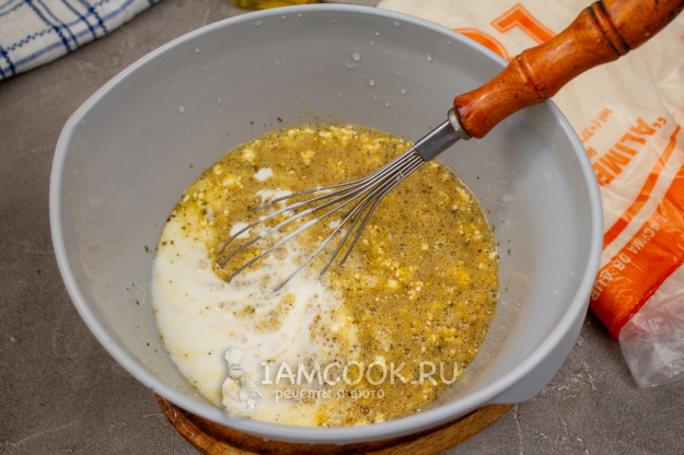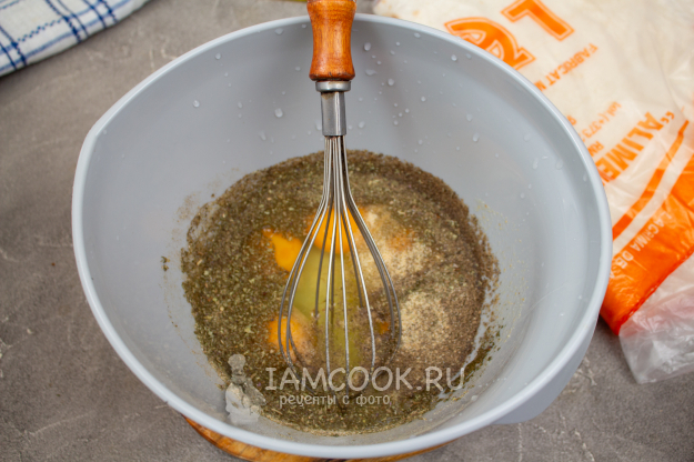 Для заливки смешайте в подходящей посуде куриные яйца, соль и черный молотый перец. Для аромата я добавила еще немного сушеного чеснока и базилика.