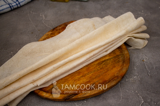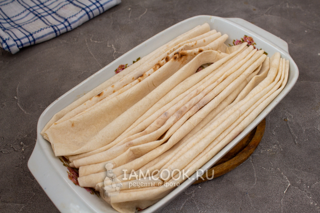 Форму для запекания смажьте маслом, выложите заготовки из лаваша в виде гармошки. Лаваш должен быть чуть ниже бортиков формы. У меня гармошка из трех лавашей, общий вес - 225 грамм.