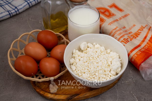 Соберите необходимые продукты для приготовления пирога из лаваша гармошкой. В качестве начинки я взяла творог, кефир и яйца. Лаваш понадобится тонкий, армянский. У меня 3 листа лаваша по 75 г, они как раз идеально подходят по размеру для моей формы. Если у вас один длинный, то нарежьте его на прямоугольники, чтобы они были одного размера с шириной формы.