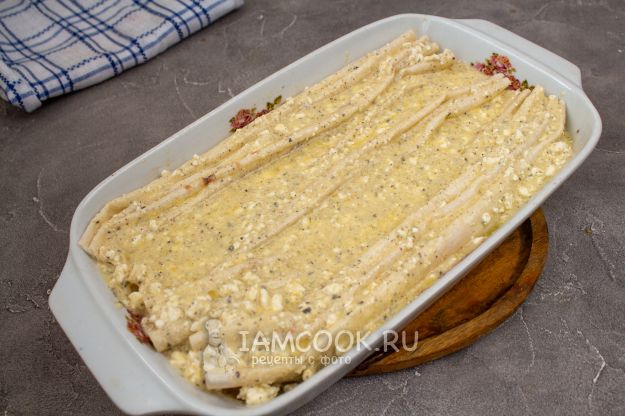 Залейте аккуратно заливкой, стараясь, чтобы она проникла во все складки. Выпекайте пирог в разогретой до 180 градусов духовке 35-40 минут.