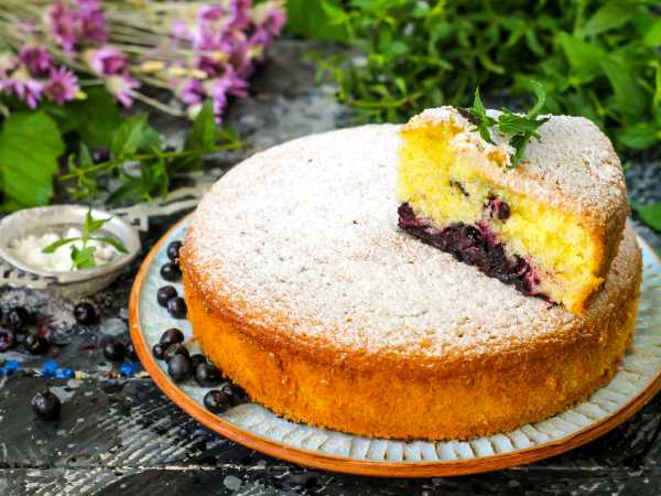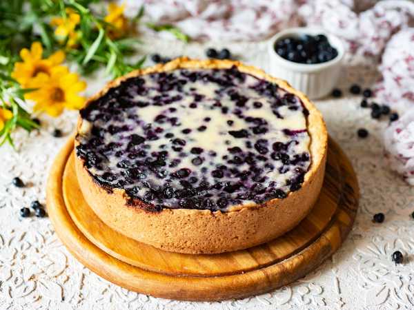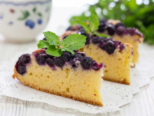 Поместите емкость на плиту, включая минимальный нагрев. Накройте крышкой и запекайте пирог с черникой на сковороде около 45-50 минут. Время приготовления зависит от диаметра сковороды и мощности нагрева вашей плиты. Пирог должен вырасти в объеме, пузыри в тесте должны лопнуть. Верхушка должна стать пропеченной. Проверьте пирог на готовность с помощью деревянной шпажки.