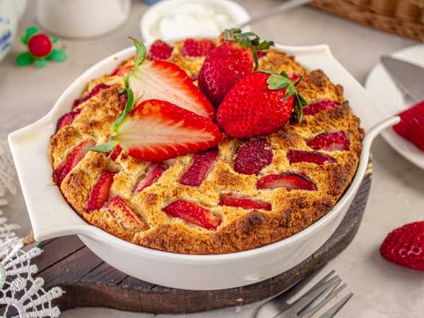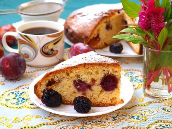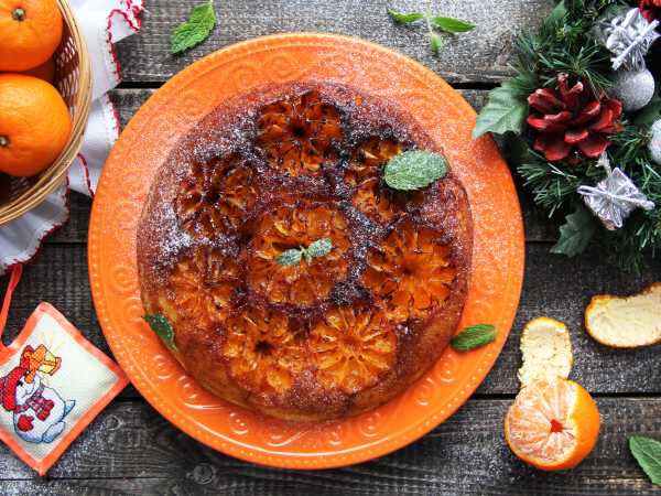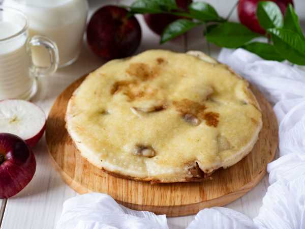 Накройте тарелкой и переверните сковороду вверх дном. Пирог выпадет на тарелку. Дайте ему остыть.