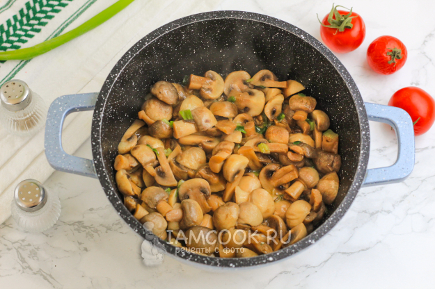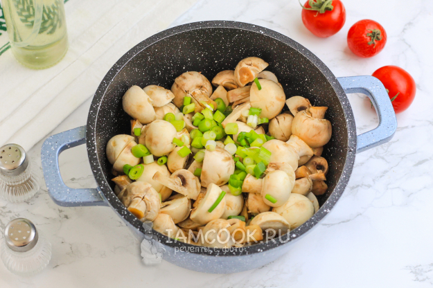 Влейте в казан или кастрюлю с антипригарным дном растительное масло. Всыпьте грибную нарезку и добавьте измельченный промытый зеленый лук. Обжарьте примерно 5-7 минут на среднем нагреве, не забыв посолить.