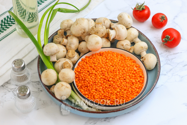 Продукты для приготовления красной чечевицы с грибами - перед вами!