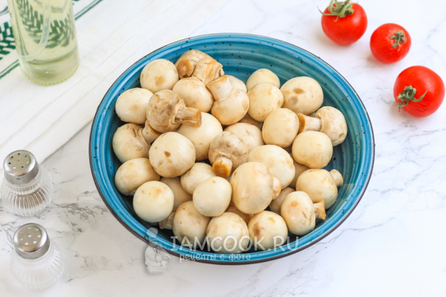 Грибы промойте в воде. Если они крупные, то разрежьте на 4-6 частей, если мелкие, то на 2 части.