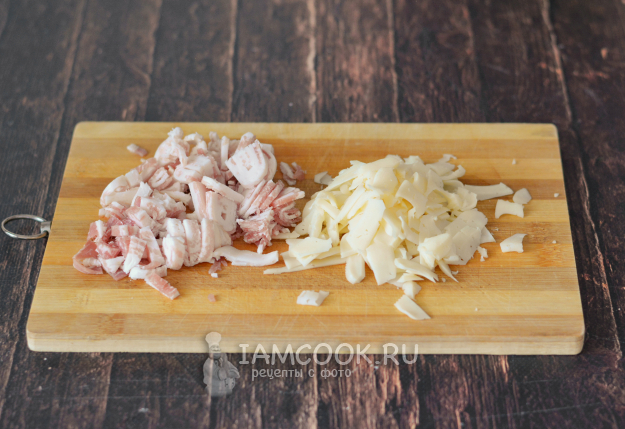 Натрите на терке сыр, а бекон нарежьте тонкой соломкой.
