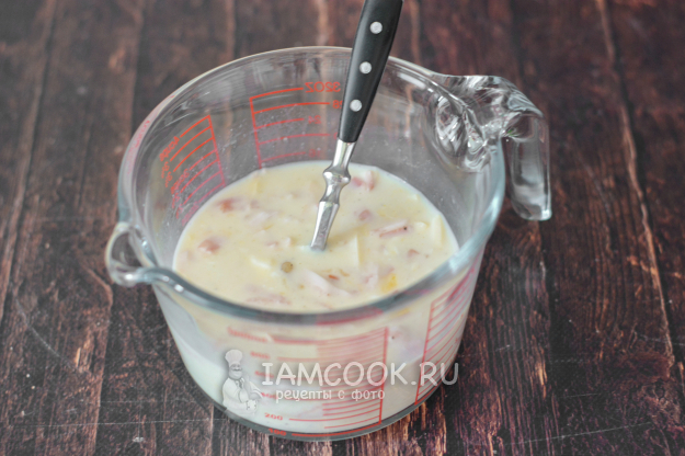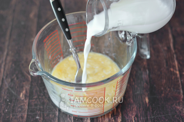 В миску вбейте яйца, посолите и поперчите по вкусу, добавьте сметану и смешайте всё вилкой в единую массу.
