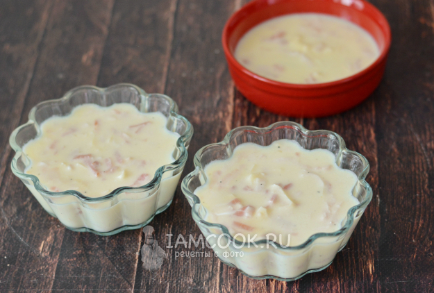 Разлейте массу по порционным формочкам, оставляя примерно 1 см сверху для подъема омлета.