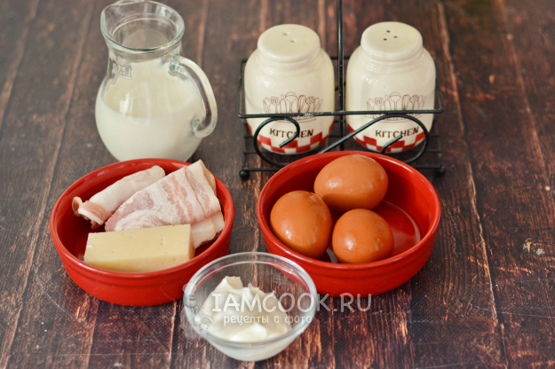 Для приготовления омлета с беконом и сыром в духовке соберите всё необходимое.