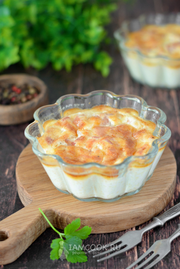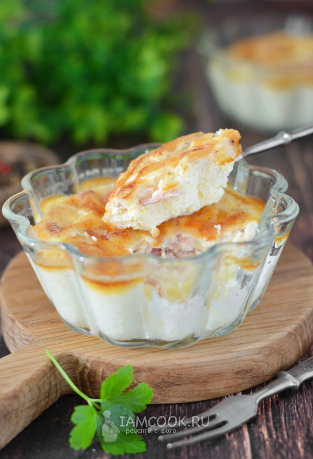 Подавать порционный омлет с беконом и сыром можно (и нужно) непосредственно в тех формочках, в которых он готовился.