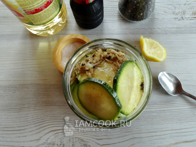 Кабачок нарезать толстенькими кружочками. Сложить в чистую банку.