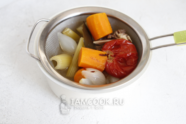 По истечении времени аккуратно отбросить кости и овощи на дуршлаг, процедить бульон.