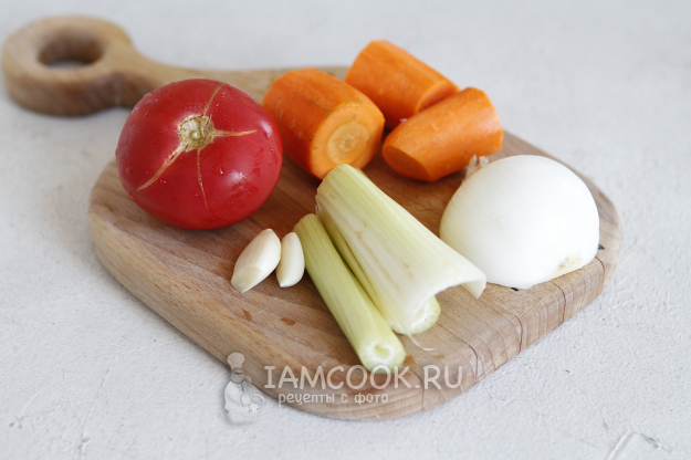 Чем больше в бульоне овощей, тем ароматнее получится бульон. Набор овощей выбирайте на свое усмотрение. Подготовленные овощи необходимо почистить. Все овощи я нарезаю крупно, помидор добавляю целиком, как и зубчики чеснока.