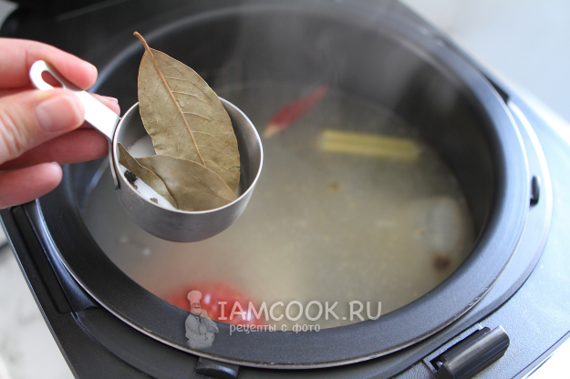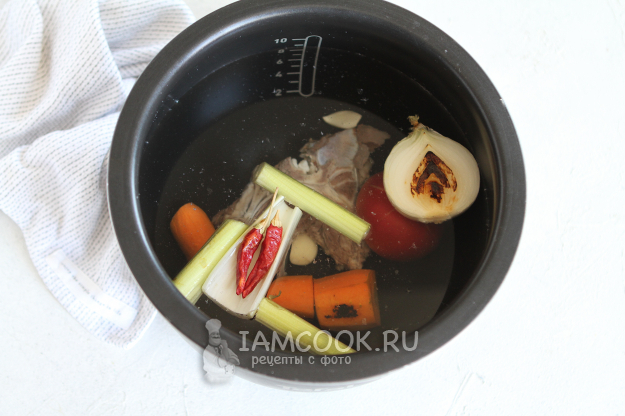 Выставляем режим "Суп". Далее необходимо дождаться, пока закипит вода, аккуратно снять пенку, закрыть крышку и варить мясной бульон в мультиварке 2-2,5 часа. Вместе с овощами я добавляла перец чили (его добавляем по желанию).