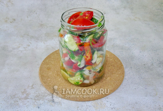 После разложите в стерилизованные банки. Залейте соком, который образовался в миске, пока овощи стояли.