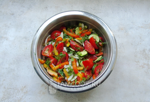 Налейте растительное масло и перемешайте салат. Дайте ему постоять при комнатной температуре 20-30 минут. За это время овощи выделят сок.