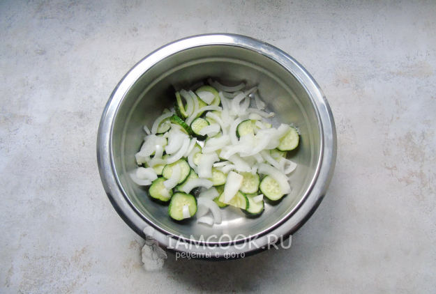 Огурцы нарежьте кружками, а репчатый лук - полукольцами или четвертинками колец. Выложите в широкую миску.