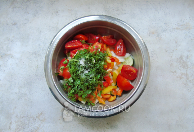 Мелко нарежьте петрушку с укропом и выложите в миску с овощами. Насыпьте соль.