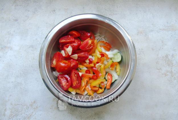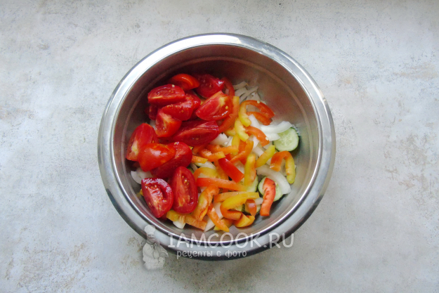 Небольшие помидоры нарежьте четвертинками. Болгарский перец очистите от семян и нарежьте соломкой.