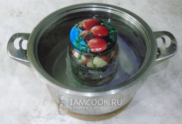 Прикройте банки стерилизованной крышкой и поставьте в кастрюлю с тряпичной салфеткой на дне. Налейте в кастрюлю воду до плечиков банок. Стерилизуйте 20 минут с момента закипания воды в кастрюле.