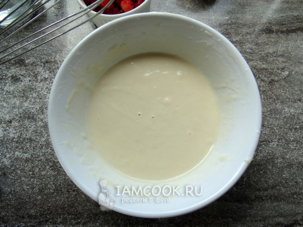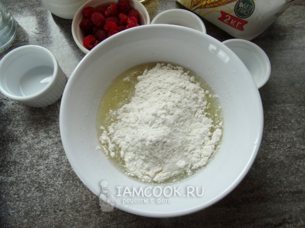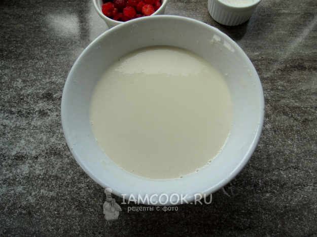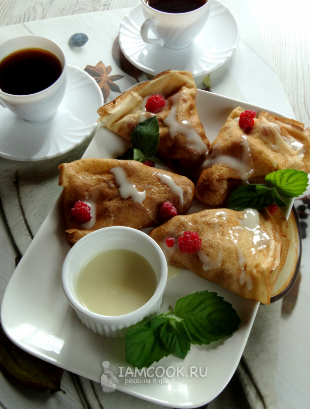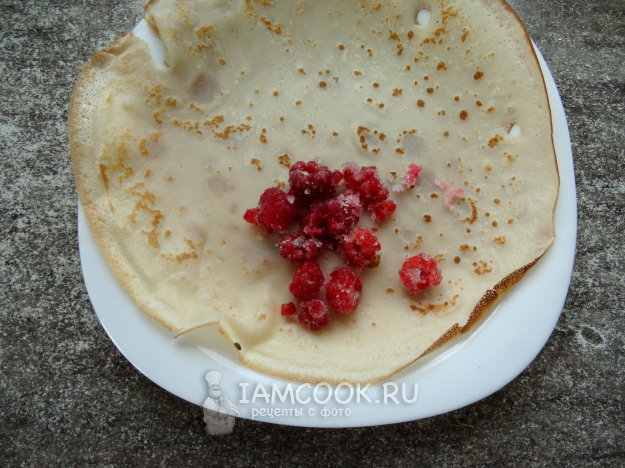 Малину перемешать с сахаром (если не любите, чтобы сахар хрустел, сделайте малину заранее, чтобы он успел раствориться). Выложить на горячий блин ложку-две начинки. Свернуть треугольником, трубочкой или конвертом.