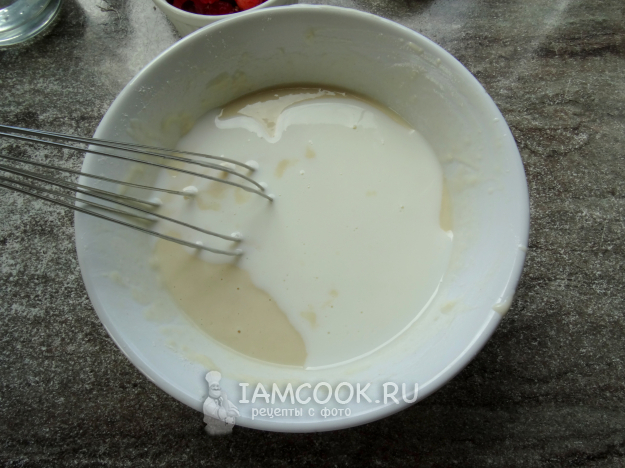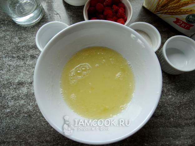 В миске соединить яйцо, воду, соль, сахар и масло.