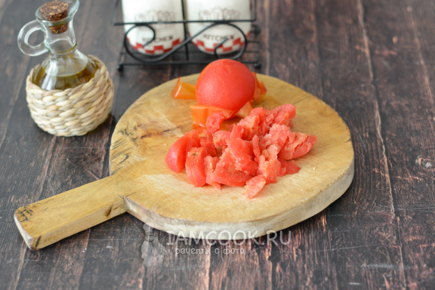 Помидоры обдайте кипятком, снимите с них кожицу и нарежьте мелко.