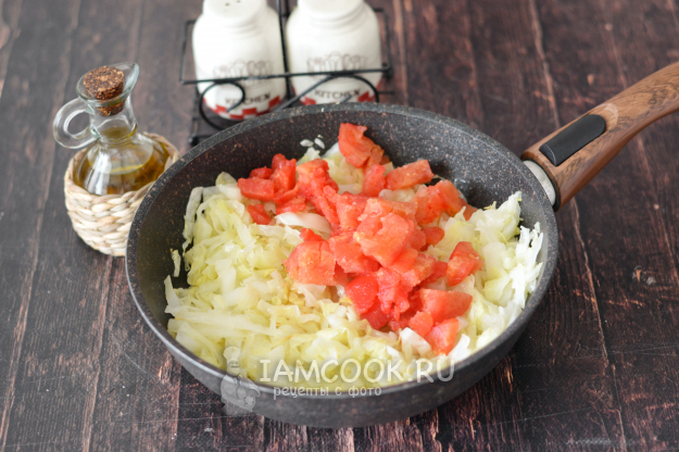 Затем добавьте нарезанные помидоры и продолжайте обжаривать всё вместе, периодически помешивая.