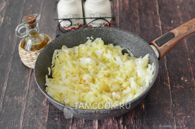 На сковороде разогрейте масло на довольно сильном огне и выложите капусту. Во время жарки сковороду крышкой не накрывайте, иначе капуста у вас начнёт тушиться в собственном соку. Солить пока тоже не нужно, поскольку от соли капуста пустит сок.