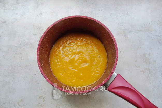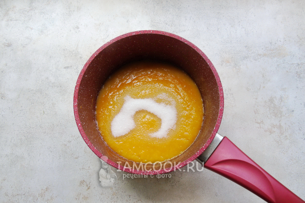 Добавьте сахар и перемешайте. Варите персиковое пюре 20-25 минут и выключайте плиту.
