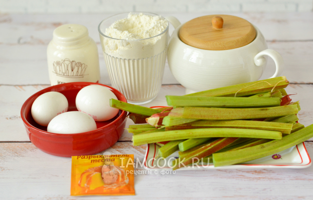 Для выпечки бисквитного пирога с ревенем подготовьте все необходимые продукты.