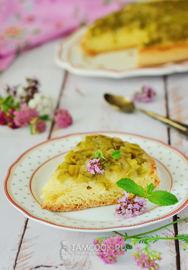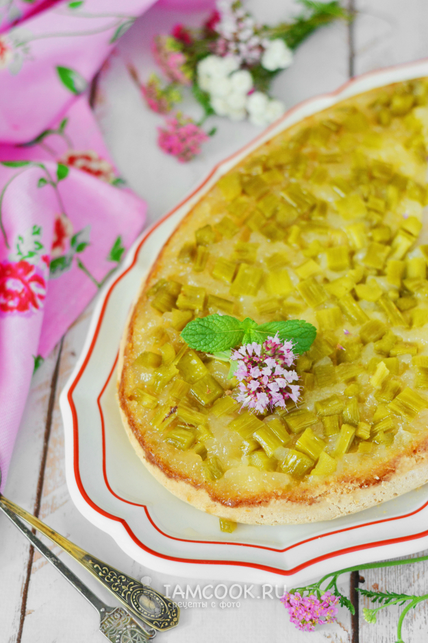 Бисквитный пирог с ревенем не нуждается ни в каком украшении, так как карамелизованные кусочки ревеня сами по себе смотрятся симпатично.