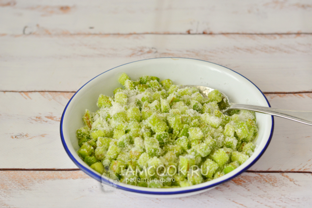 Очищенный ревень нарежьте на кусочки примерно по 1 см и засыпьте сахаром, перемешайте и пока отставьте в сторонку.