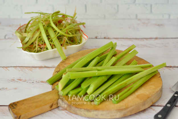 Черешки ревеня тщательно вымойте и обсушите. Срежьте с черешков кожицу при помощи овощечистки или ножа.
