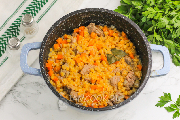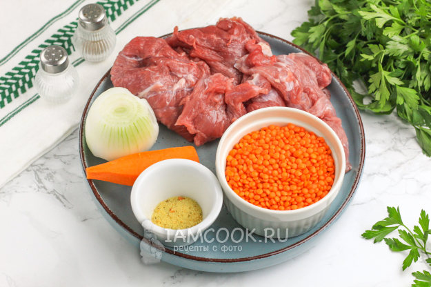 Продукты для приготовления говядины с красной чечевицей - перед вами!