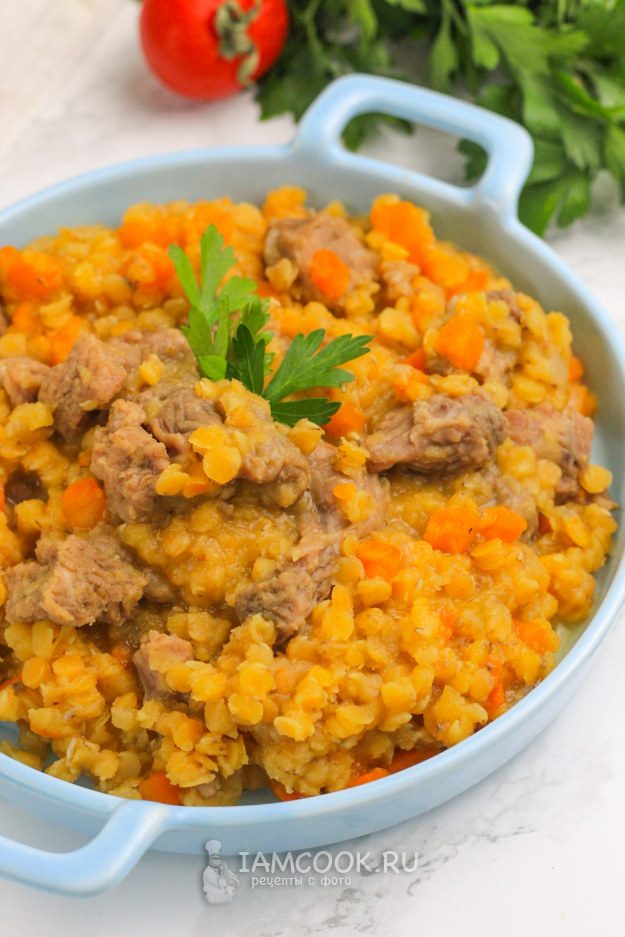 Затем выложите говядину с красной чечевицей на тарелки и подайте к столу теплой вместе со вкусными соусами, салатами.