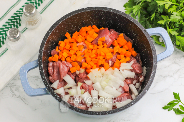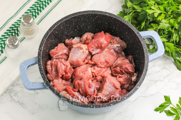 С кусочков говядины срежьте жилы и пленки, промойте их в воде. Чем меньше будет размер кусочков, тем быстрее они проварятся и станут мягкими, но и слишком мельчить мясо не нужно! Выложите говядину в казан или кастрюлю с антипригарным дном.