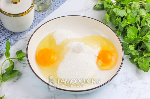 Куриные яйца вбейте в глубокую емкость и добавьте соль, сахарный песок. Взбейте венчиком или вилкой в течение 3-4 минут. Не обязательно взбивать миксером - тесто и так отлично поднимется. Яйца можно использовать прямо из холодильника, охлажденные.