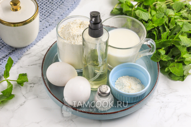 Продукты для приготовления теста для пирогов на сковороде - перед вами! Я рассчитываю на сковороду диаметром 24 см. Если у вас она больше - 26 или 28 см, то можете смело добавить в тесто еще 1 куриное яйцо и 30 г пшеничной муки.