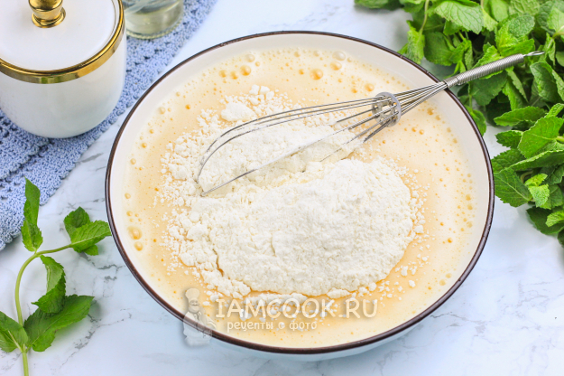 Влейте растительное масло без аромата, перемешайте и всыпьте пшеничную муку высшего сорта и разрыхлитель. Если разрыхлителя нет в наличии, то погасите 1 ч.л. соды уксусом. Аккуратно всё вмешайте, но не взбивайте, чтобы не образовались комочки. Если хотите добавить различные сладкие специи и пряности, то сделайте это после добавления муки.