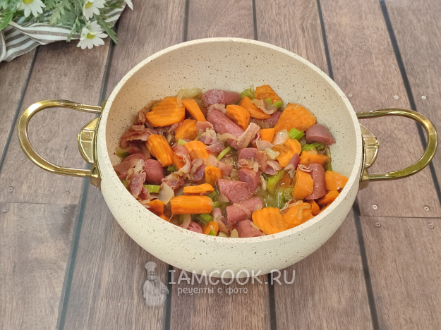 Отправляем сельдерей, крупно нарезанную морковь, обжарим еще минут 5-7. Затем добавим колбаски и вино. Тушим минут 10.