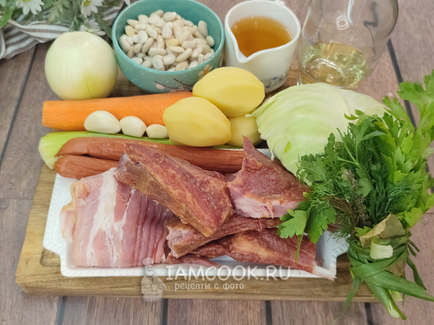 Соберите ингредиенты для приготовления французского супа Гарбюр. Вы можете добавить корни петрушки, пастернака, сельдерея, репу, кольраби, стручковую фасоль - всё, что есть, что вам нравится, суп будет только вкуснее и насыщеннее.